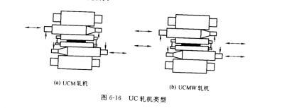 四輥軋機(jī)工作輾的撓度如圖 6-17 所示。由于在工作輥與支承輥的接觸壓扁上存在著有害的 A 區(qū),即大于軋制帶材寬度的工作輥與支承輥的接觸區(qū),因此,在 A接觸區(qū)的接觸應(yīng)力形成一個(gè)使軋輾撓度加大的有害彎矩。這樣工作輥的撓度不僅取決于軋制力,而且也取決中間輥彎輥裝置。根據(jù) HCM六輥軋機(jī)的形式增加中間輥彎輥裝置的 UC軋機(jī)稱(chēng)為 UCM 軋機(jī)廠圖6-16(a),而具有中間輥和工作輥都能抽動(dòng)又有中間輥彎曲裝置的 UC軋機(jī)稱(chēng)為UCMW軋機(jī)「圖 6-16(b)。UC軋機(jī)比 HC軋機(jī)具有更大的壓下量和更強(qiáng)的板形控制能力,可以軋制更薄、更寬、更硬的板帶,并能較好地控制復(fù)合浪形和邊部減薄量,適合于軋制薄而寬且具有一些特殊要求的板材。