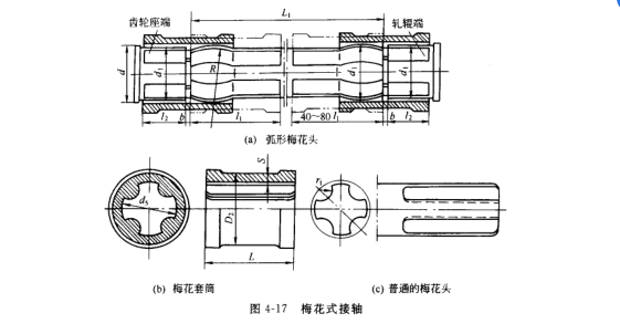 由于型鋼軋機(jī)軋輥間的徑向調(diào)整量小,并且經(jīng)常換輥,輥普遍采用梅花接軸,如圖4-17所示,這種接軸允許傾角為1°~1.5°的場合。而較大優(yōu)點(diǎn)是換輥方便,缺點(diǎn)是運(yùn)轉(zhuǎn)中有沖擊和噪音,在干摩擦條件下工作,很容易磨損。