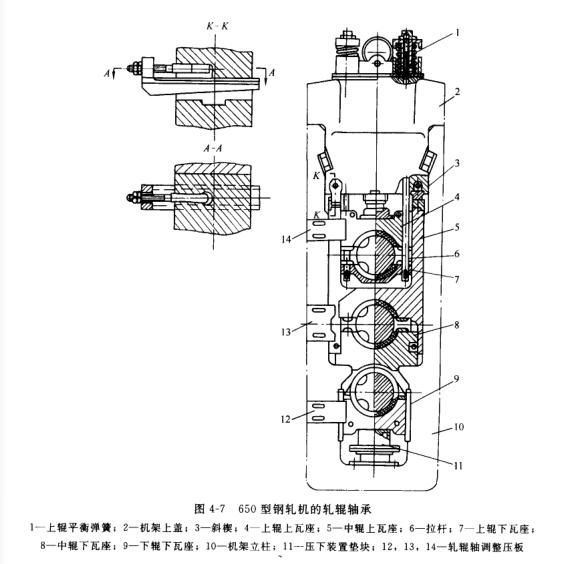 圖4-7所示中,裝有軸向壓板12,13,14,其作用為對正軋槽,固定軋輥的軸向位置,承受軸向力以及在止推襯瓦磨損時軸向移動軸承座。軸向壓板調(diào)整裝置如圖4-12所示,壓板2通過其橢圓孔套在穿過機架立柱通孔的錘頭螺栓3上,旋轉(zhuǎn)調(diào)節(jié)螺釘4,可使用壓板壓緊(或松開)軸承座。在換輥時,將錘頭螺栓的螺母松開后,壓板可沿其橢圓孔向外移開,這種機構(gòu)只能單方向(向內(nèi))軸向移動軋輥,一次,必須在每個軋輥的兩端成對設(shè)置。當欲使一端的壓板向內(nèi)調(diào)整時,另一端的壓板必須松開,從而使軋輥軸向固定。這種結(jié)構(gòu)比較簡單,便于換輥操作。