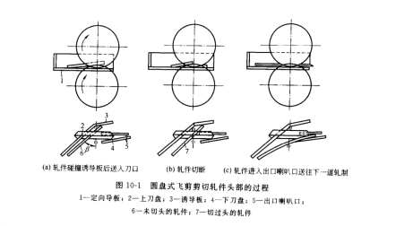 圓盤式飛剪剪切軋件頭部的過程如圖 10-1所示。飛剪的剪切機(jī)構(gòu)由一對(duì)轉(zhuǎn)動(dòng)方向相反的圓盤刀片組成,圓盤式飛剪之所以能橫向剪切運(yùn)動(dòng)著的軋件,主要是由于刀盤軸線與軋件運(yùn)動(dòng)方向傾斜一定角度,并目使圓盤刀片圓周速度在軋件運(yùn)動(dòng)方向上的分速度與軋,件運(yùn)動(dòng)速度相等。