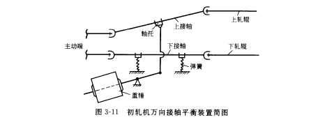 其那面說過,萬向連接軸一般都比較長,重量也比較大,為老不使萬向接軸的重量全部壓在兩端的插頭上,一般都設(shè)置了聯(lián)軸的平衡裝置。其平衡力一般比連接軸重量重10%~30%。常用的平衡裝置又彈簧平衡,中錘平衡和液壓平衡三種形式。彈簧平衡一般只用于下聯(lián)接軸的平衡,如圖3-11所示。因?yàn)橄侣?lián)軸軸所連接的軋輥在軋制過程中是不需要調(diào)整其位置的。上連接軸因?yàn)樵谲堓佭^程中輥提升兩較大,老的軋機(jī)用重錘平衡,較新的軋機(jī)都使用液壓平衡。