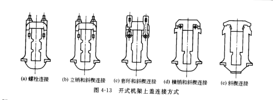 (4)橫銷和斜楔連接 這種連接方式是將機(jī)架上蓋的下部插在立柱上端的凹槽內(nèi),并用穿透的橫向圓銷連接,再用斜楔楔緊,此種連接結(jié)構(gòu)簡(jiǎn)單、 連接牢固、連接件變形小、 剛性較好、換輥方便,但由于楔緊力和軋制沖擊力的影響,橫銷易發(fā)生變形,影響拆卸和換輥。