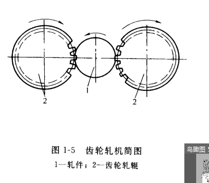 (3) 齒輪軋機(jī)、(見圖 1-5) 這類軋機(jī)將軋輥按照嚙合齒形設(shè)計,采用橫軋使齒輪成形。
